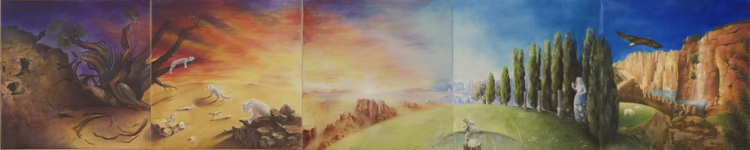 My interest in, indeed fascination with, T.S.Eliot’s poetry goes back a long time, when I chose, as my doctorate dissertation, to write about “The Influence of Dante on T.S.Eliot’s Poetry”. Re-reading his poetry after a long lapse of time, I was prompted to translate into paint the vivid images this poetry presented to my mind.